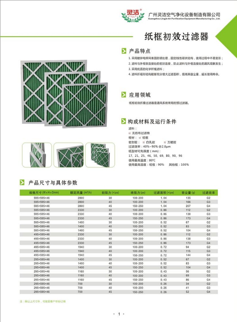 紙框初效過濾器效率:主要分為G1級、G2級、G3級、G4級四種效率。