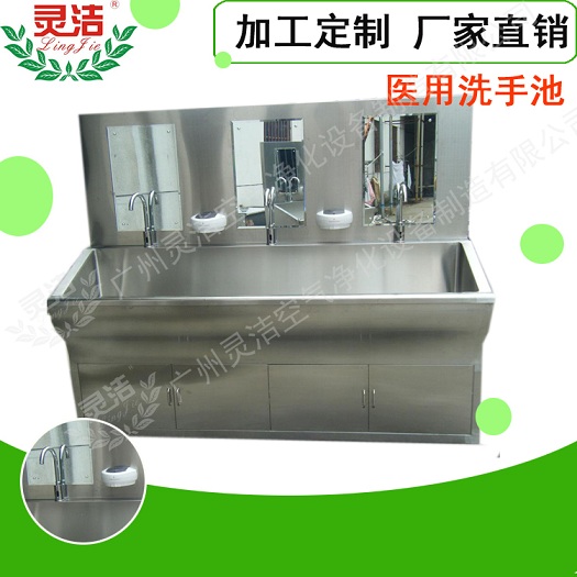 醫用洗(xǐ)手池說明:不鏽鋼醫(yī)用洗手池(chí):采用進口優質304不鏽鋼板製(zhì)造,國際(jì)標準,靜音防濺,園弧結構,恒溫出水,配備鏡燈和感應皂液器,標準型號為1人、2人、3人洗手池,可定製非標各類洗手池。說明:不鏽鋼材厚度為(wéi)1.2mm或者1.5mm,自帶50L電熱水器,可自由設定出水溫(wēn)度,出水(shuǐ)分膝(xī)碰(pèng)和感應兩種(zhǒng)方式,每個洗手位帶獨立(lì)鏡燈和鏡子(zǐ),洗手槽采用特製(zhì)的坡度設計,可有效防止(zhǐ)水濺到洗手池外,各(gè)水嘴獨立設置,不影響其它水(shuǐ)嘴的(de)使用,方便使用及維護。