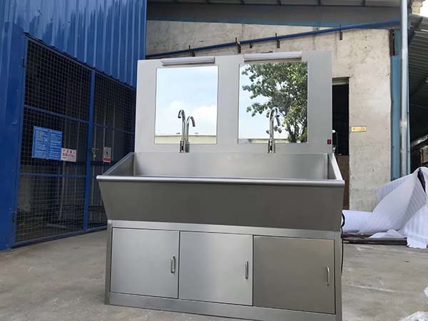 醫用洗手池說明:不鏽鋼醫用洗手池:采(cǎi)用進口優質304不鏽鋼板製造,國際(jì)標準,靜(jìng)音防濺,園弧(hú)結構,恒溫出水,配備鏡燈和感應皂液器,標準型號為1人、2人、3人洗手池,可定製(zhì)非(fēi)標各(gè)類洗手池。說明:不鏽鋼材厚度為1.2mm或者(zhě)1.5mm,自帶50L電熱水器,可(kě)自由設定出水溫度,出水分膝碰和(hé)感應兩種(zhǒng)方式,每個洗手位帶獨立(lì)鏡燈(dēng)和鏡子,洗手槽采用特製(zhì)的(de)坡度設計,可有效(xiào)防止水濺到洗手池外,各水嘴獨立設置,不影響其它水(shuǐ)嘴的使用,方便使用(yòng)及維護。